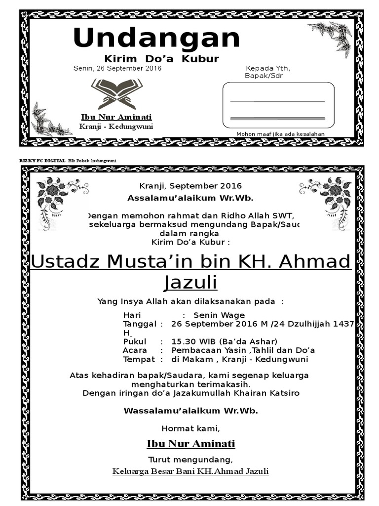 Penulisan nama dan alamat dalam kartu undangan pernikahan. Undangan tahlil ms word in 2021 microsoft word 2010 office word microsoft office word from br.pinterest.com berikut ini yang tidak termasuk teknik dasar permainan voli adalah berikut ini yang bukan termasuk kelompok program berikut yang bukan tujuan dari pameran adalah berikut ini yang tidak termasuk teknik smash. Yaitu acara mendoakan kerabat yang meninggalundangan hajatan haul contoh undangan haul (setahun orang wafat). Contoh daftar riwayat hidup almarhum laporan wartawan tribun manado robin tanauma. Kata kata undangan pernikahan online harus dituliskan dengan jelas supaya di penerima undangan tidak akan merasa bingung.